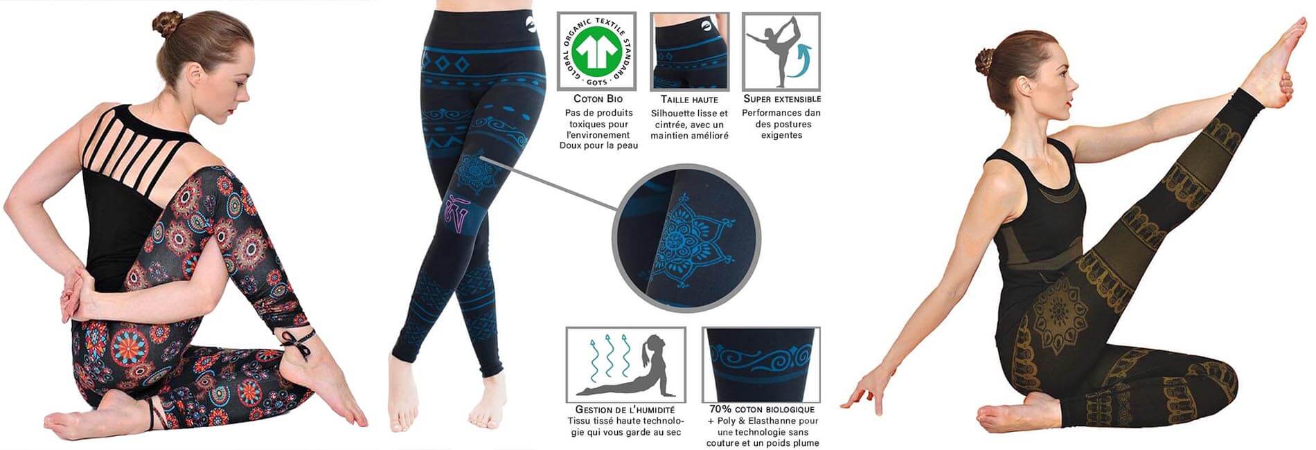 Le collant peut être taille haute ou taille basse, en coton ou en tissu technique combiné naturel et synthétique. Sa particularité est d'offrir un univers inspirant et régénérateur, par les motifs employés, qui peuvent être un design holistique, des symboles sacrés, minutieusement rapportés dans leur représentation originelle ou dans une forme artistique. Ces motifs sont brodés, imprimés ou les deux à la fois. Certains leggings peuvent avoir aussi des parties de ces motifs peints à la main avec des peintures écologiques résistantes aux lavages. La majeur partie de nos leggings sont conçus dans cet esprit.