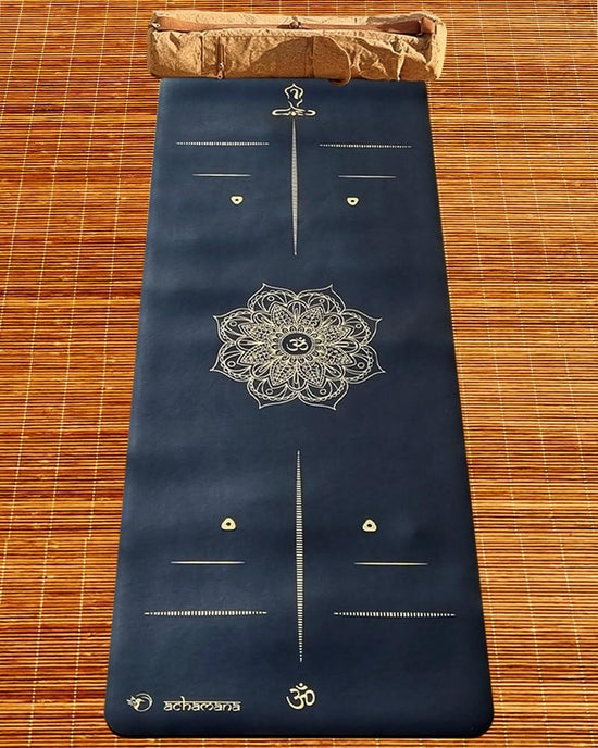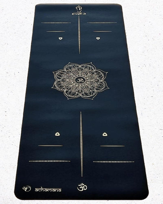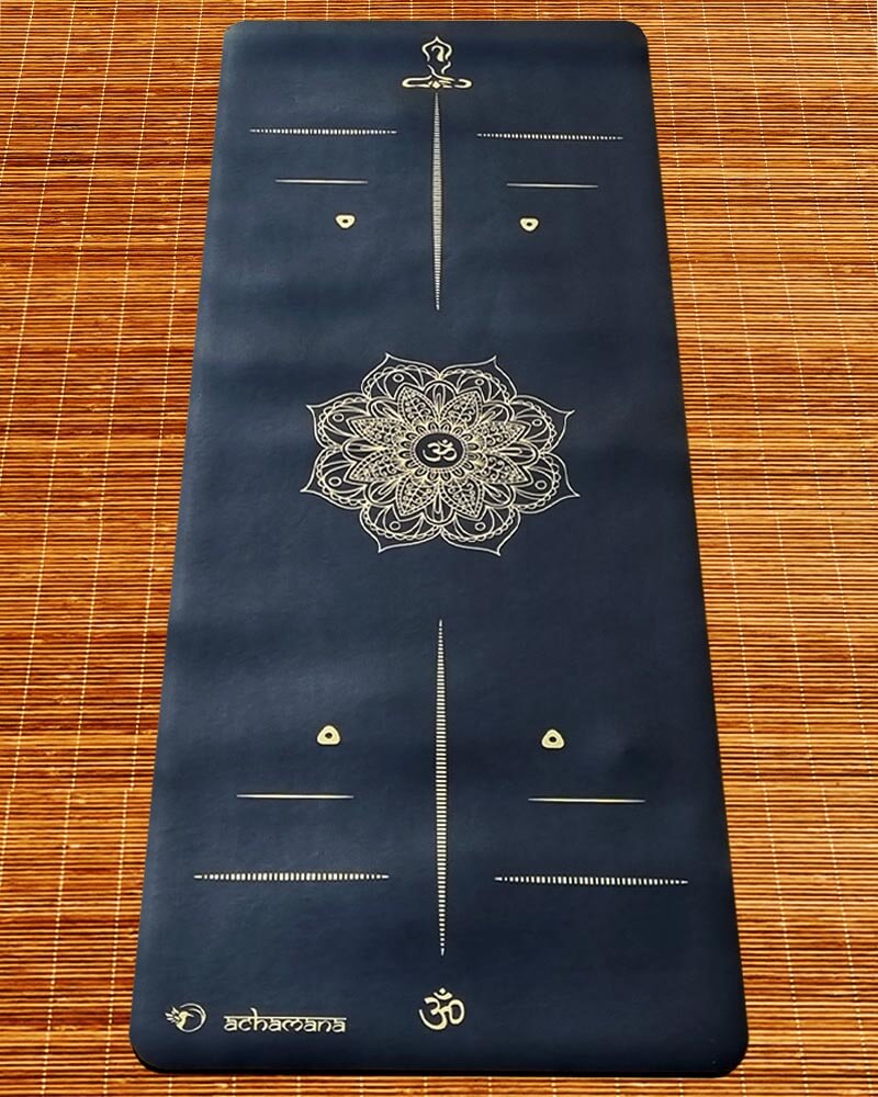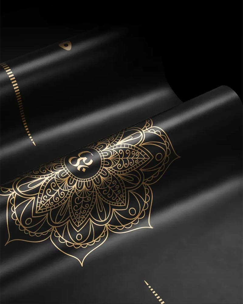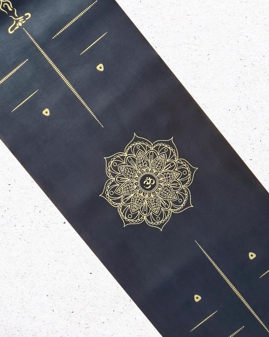Tapis de yoga Pro antidérapant caoutchouc et similicuir 5mm - Mandala et marqueurs position Or