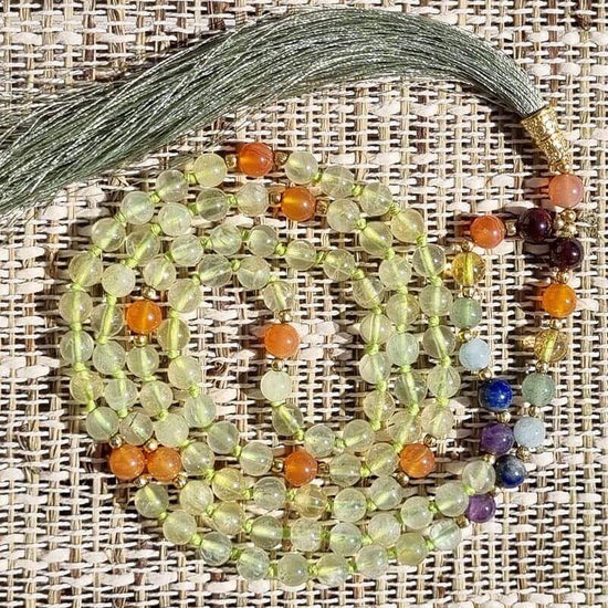 Prehnite mala necklace - Carnelian 7 Chakras - 108 beads 6mm
