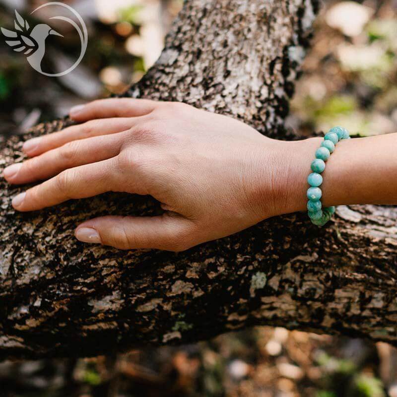 Vreugde en tederheid communiceren, zonder angst, is de boodschap van deze armband. Het pbeschikt over een harmonieus werk aan de keelchakra, Vishuddha en de opening van de hartchakra, Anahata.