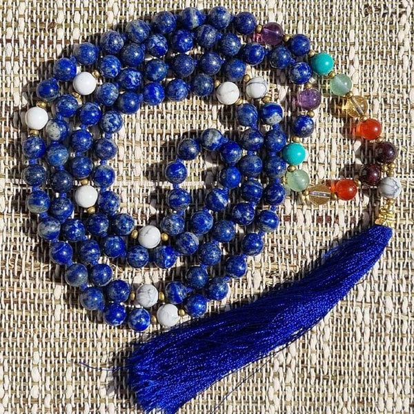 Un collier mala en Lapis lazuli diffuse des vibrations d'honnêteté, de droiture et de compassion.