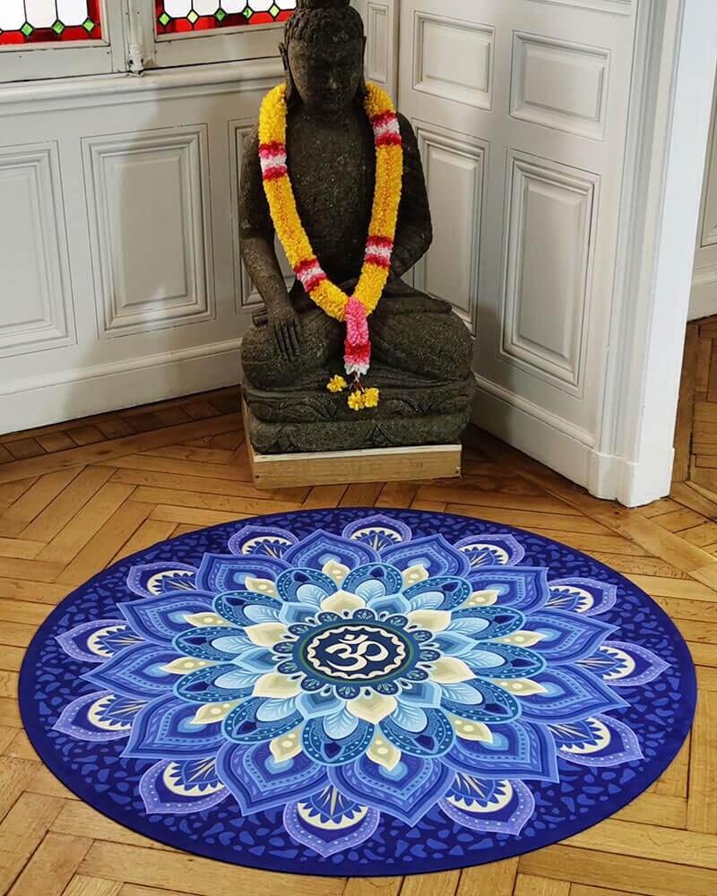Vous pouvez concentrer votre attention sur un mandala pendant que vous méditez. Par sa symétrie, votre attention est dirigée vers le centre, qui, pour ce tapis, vibre dans l'énergie du symbole Om.