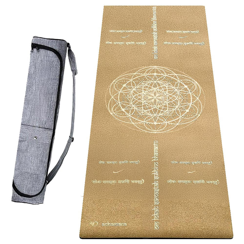 - Lignes de positionnement : Pour un placement symétrique correct des pieds et des mains. Très utile, par exemple, pour un asana comme “Adho Mukha Svanasana” la fameuse posture du « Chien tête en bas » ici c'et le mantra traduit en lettres devanāgarī et en Sanskrit le long de la surface de pratique.